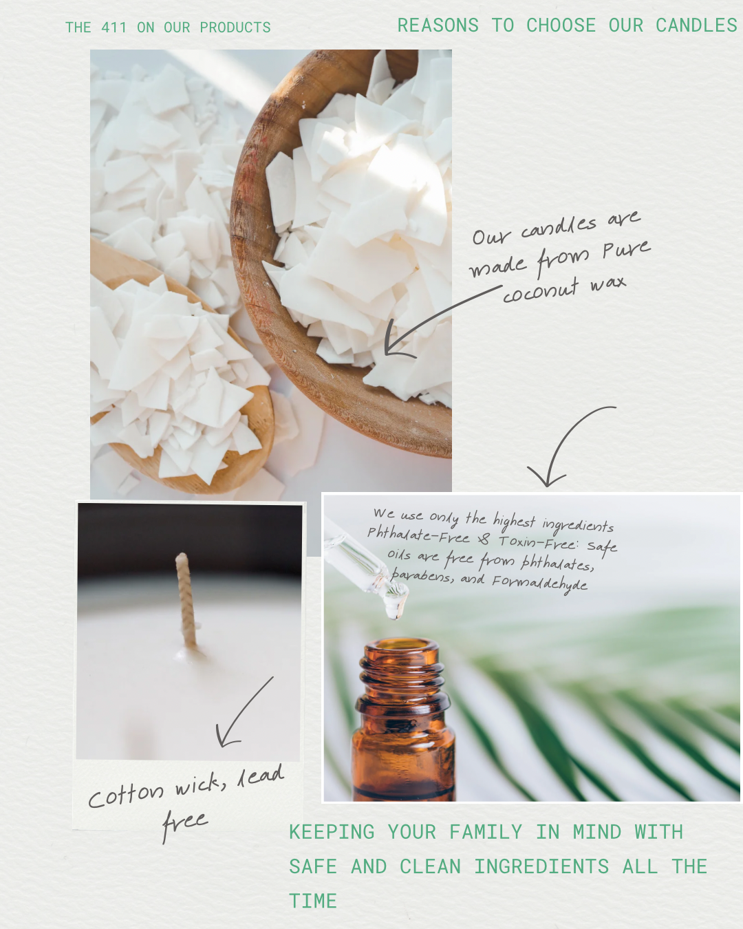 Hand-poured candles made with clean, non-toxic ingredients that are safe for you, your family, and even your furry ones. Each candle is created in small batches using natural luxurious coconut wax, phthalate-free fragrance oils, and eco-friendly wicks giving you a slow, even burn that fills your space with peace, warmth, and elegance.